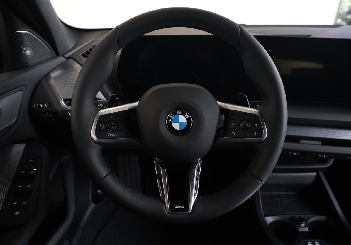 Tříramenný M kožený volant s multifunkčními tlačítky a integrovaným airbagem řidiče. Díky věnci volantu čalouněnému černou kůží Walknappa s černým prošíváním a vybráním na palce je příjemný na dotek a poskytuje bezprostřední zážitek ze sportovní jízdy.
