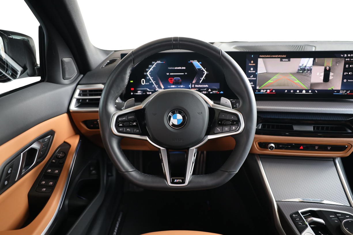 Tříramenný M kožený volant s multifunkčními tlačítky a integrovaným airbagem řidiče. Díky věnci volantu čalouněnému černou kůží Walknappa s černým prošíváním a vybráním na palce je příjemný na dotek a poskytuje bezprostřední zážitek ze sportovní jízdy.