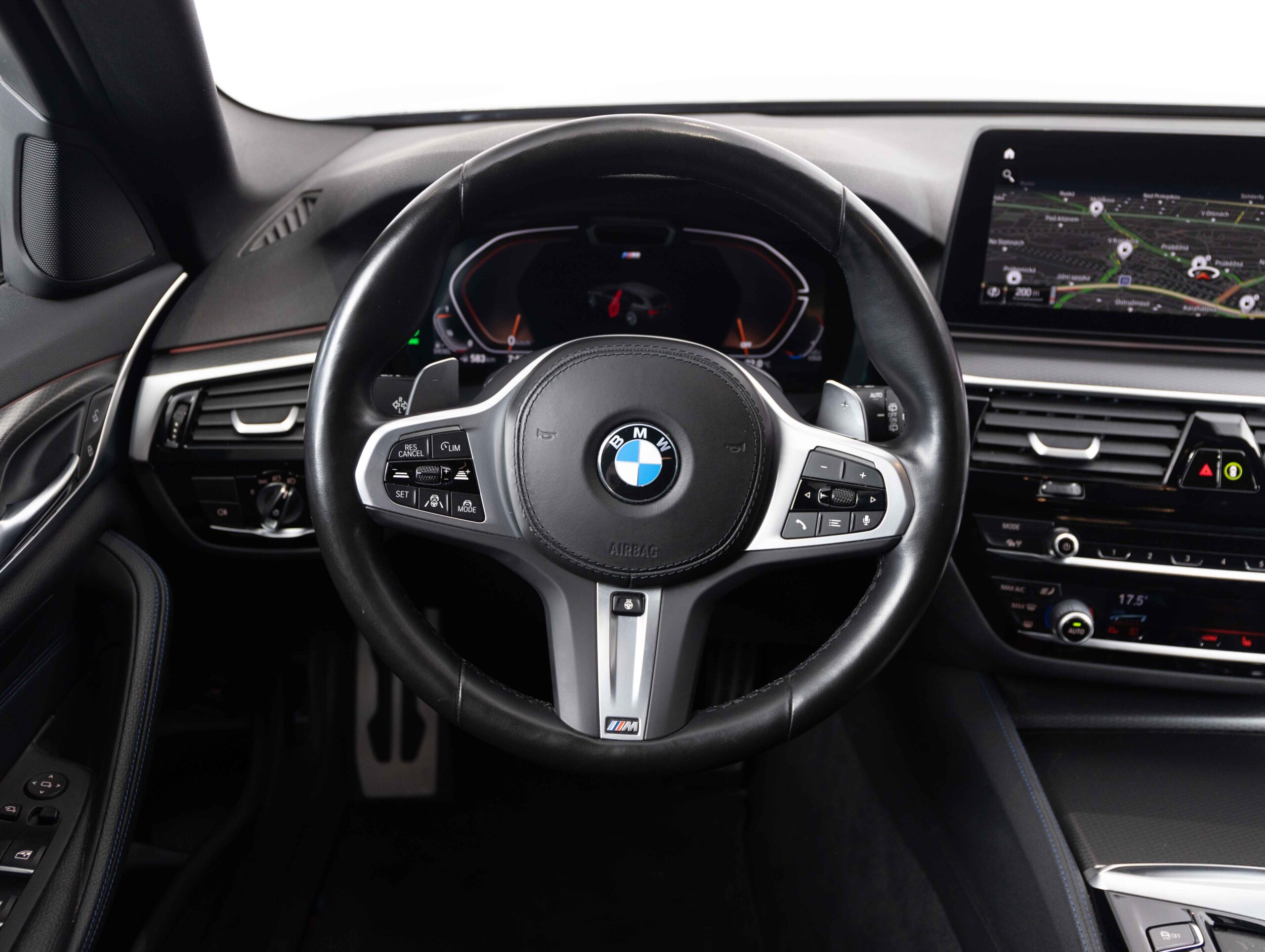 Tříramenný M kožený volant s multifunkčními tlačítky a integrovaným airbagem řidiče. Díky věnci volantu čalouněnému černou kůží Walknappa s černým prošíváním a vybráním na palce je příjemný na dotek a poskytuje bezprostřední zážitek ze sportovní jízdy.