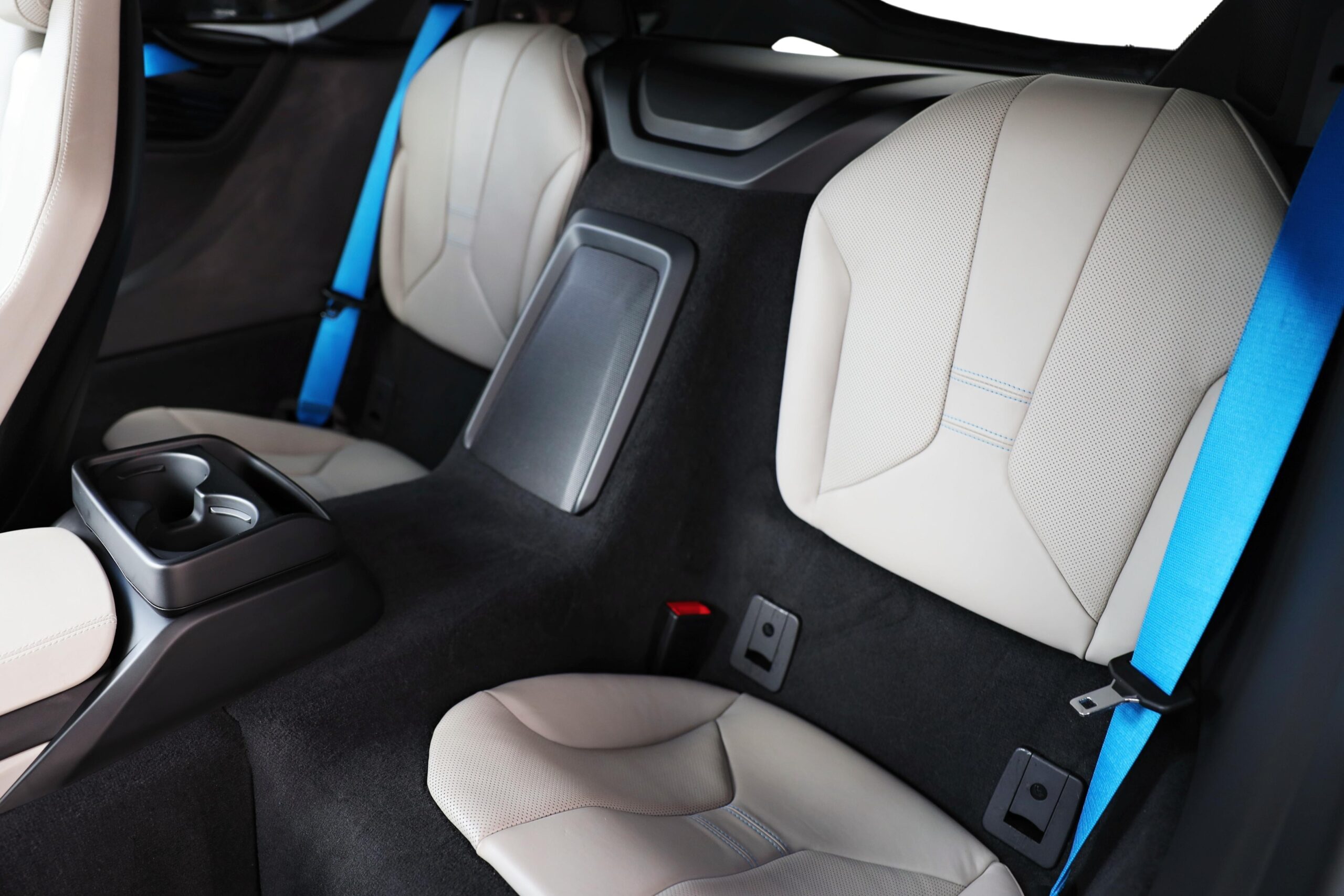 Bezpečnostní pásy všech čtyř sedadel v modré barvě BMW i Blue.