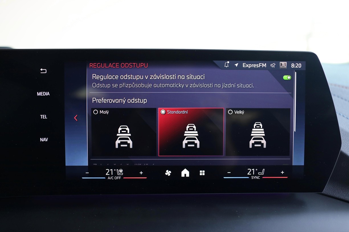 Aktivní systém pro udržování rychlosti s funkcí Stop&Go, včetně upozornění na nebezpečí kolize s vozem jedoucím vpředu, udržuje rychlost předvolenou řidičem až do 210 km/h a rovněž vzdálenost od vozidla jedoucího vpředu. V případě potřeby upraví asistent maximální povolené rychlosti rychlost jízdy na aktuální maximální povolenou rychlost, která je stanovena informacemi o maximální povolené rychlosti s ukazatelem zákazu předjíždění.