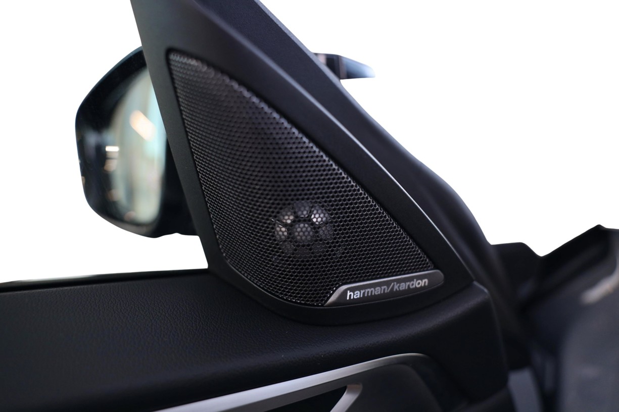 Reproduktory prémiové kvality s šestiúhelníkovými perforovanými kryty v provedení Titanium Dark doplňují vysokopásmové reproduktory v předních dveřích s nápisy Harman Kardon. Zvuk lze přizpůsobit prostřednictvím osvědčeného ergonomického ovladače iDrive a kontrolního displeje.