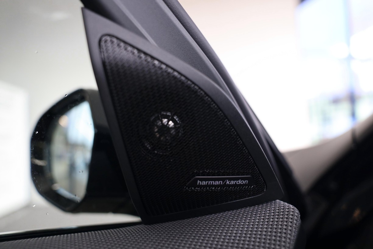 Reproduktory prémiové kvality s šestiúhelníkovými perforovanými kryty v provedení Titanium Dark doplňují vysokopásmové reproduktory v předních dveřích s nápisy Harman Kardon. Zvuk lze přizpůsobit prostřednictvím osvědčeného ergonomického ovladače iDrive a kontrolního displeje.