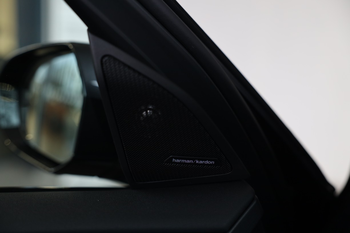 Reproduktory prémiové kvality s šestiúhelníkovými perforovanými kryty v provedení Titanium Dark doplňují vysokopásmové reproduktory v předních dveřích s nápisy Harman Kardon. Zvuk lze přizpůsobit prostřednictvím osvědčeného ergonomického ovladače iDrive a kontrolního displeje.