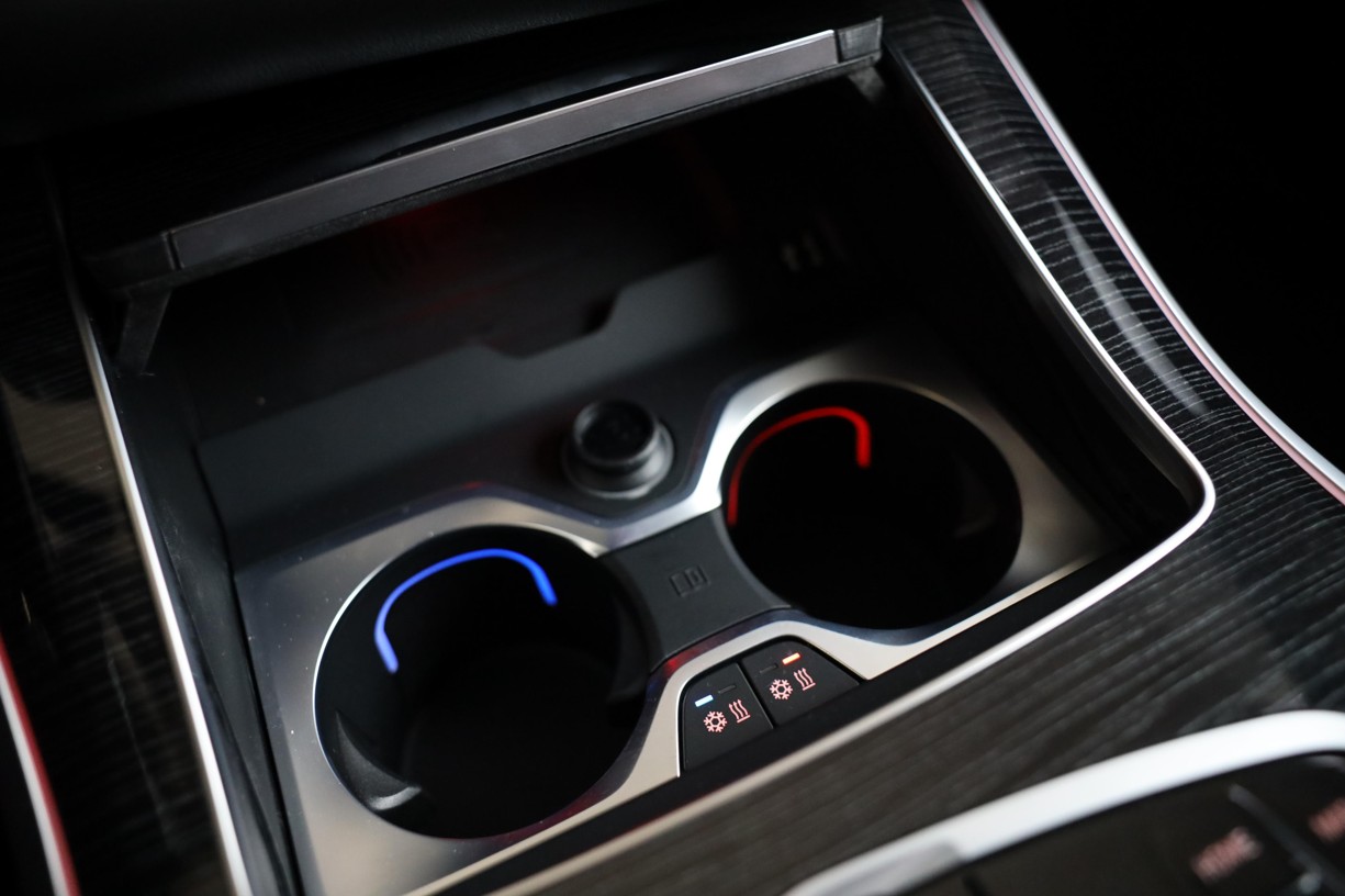 Držáky nápojů s ovládáním teploty ve středové konzole lze odděleně vyhřívat nebo chladit. Požadované chlazení nebo vyhřívání nápojů se aktivuje pomocí jednotlivých tlačítek na levé a pravé straně držáku nápojů. Barevné prostorové osvětlení uvnitř držáku také naznačuje, zda se nápoje zahřívají (červená) nebo chladí (modrá barva). Díky tomu mají nápoje při jízdě vždy požadovanou teplotu.