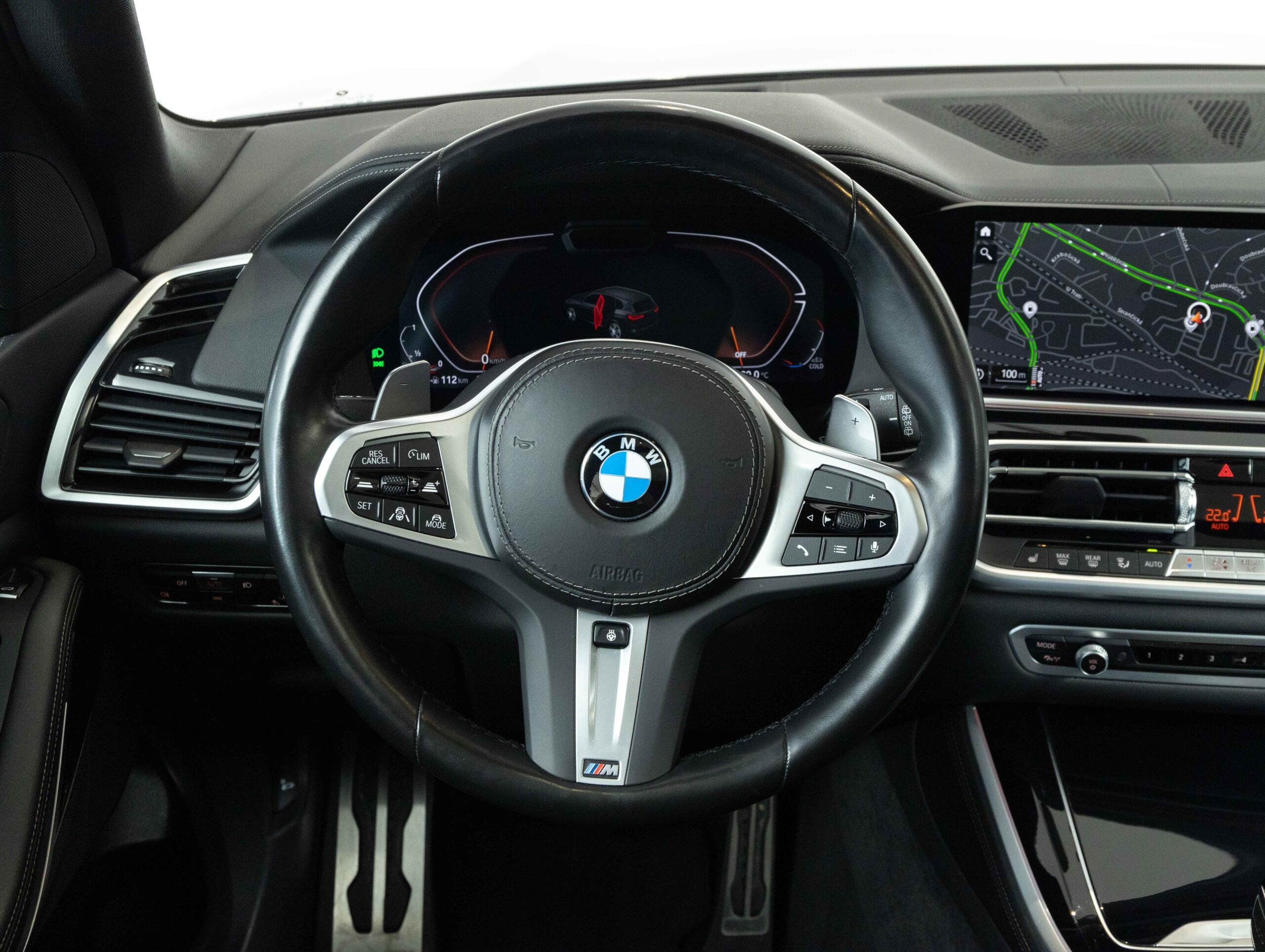 Tříramenný M kožený volant s multifunkčními tlačítky a integrovaným airbagem řidiče. Díky věnci volantu čalouněnému černou kůží Walknappa s černým prošíváním a vybráním na palce je příjemný na dotek a poskytuje bezprostřední zážitek ze sportovní jízdy.